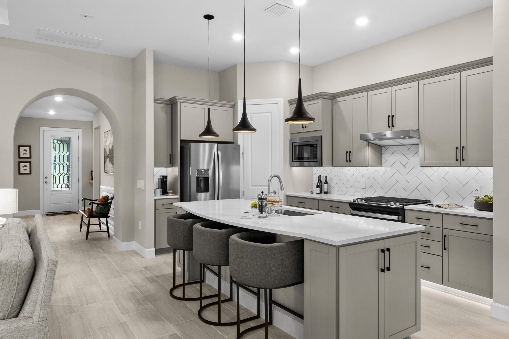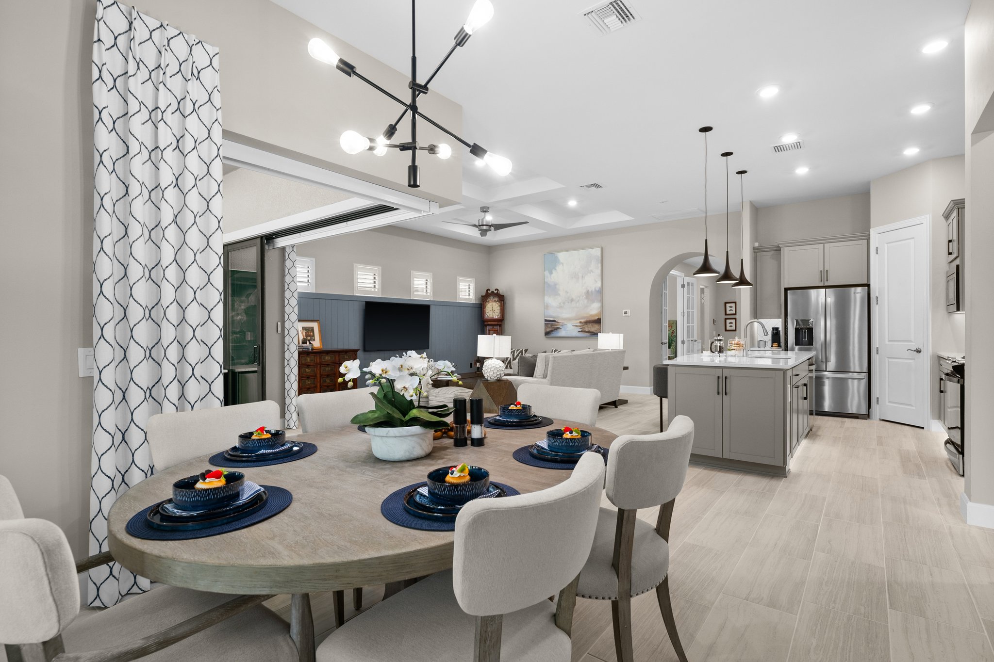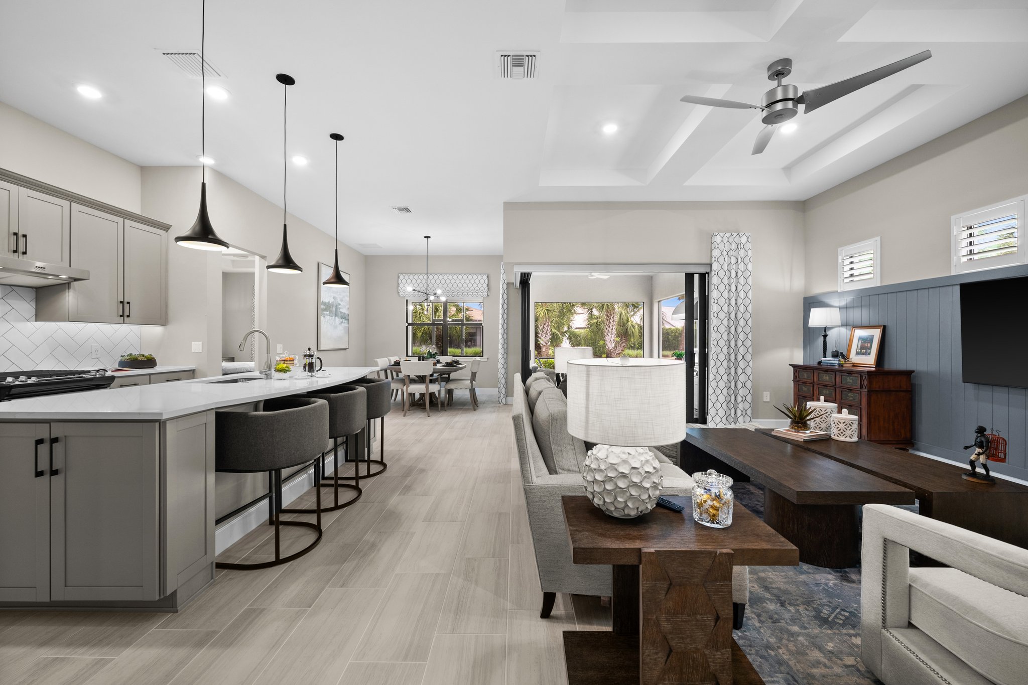 Built in 2022, this thoughtfully designed home offers over 2,000 sq ft of open living space, including a stylish kitchen with quartz countertops, stainless steel appliances, and a generous center island. A zero-corner sliding glass door opens to an extended, covered lanai—perfect for entertaining or relaxing in the Florida sunshine.